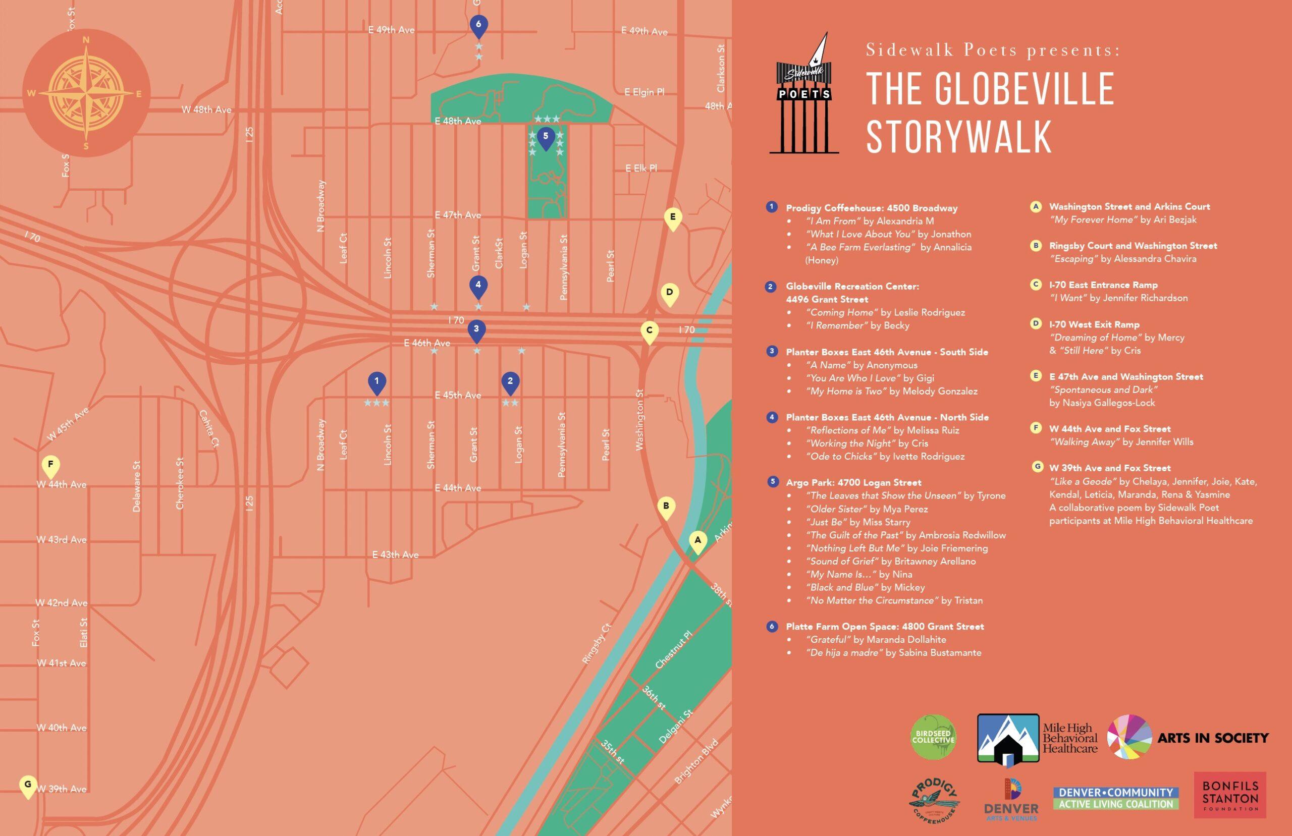 An interactive art installation created by Sidewalk Poets in conjunction with Denver Arts and Venues, Arts in Society and Bonfils Stanton Sidewalk Poets hosted creative writing and storytelling workshops within the Globeville community—and created the Globeville StoryWalk from the words, poems and voices of the neighborhood.